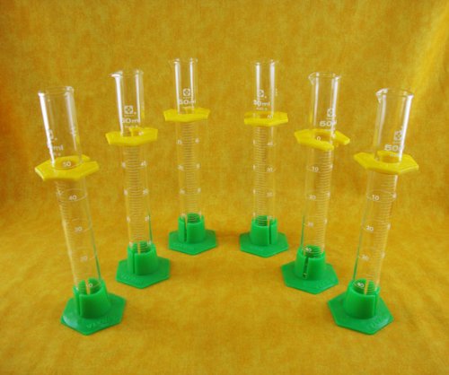 - A pack of 6 50ml graduated cylinders with bumper guards